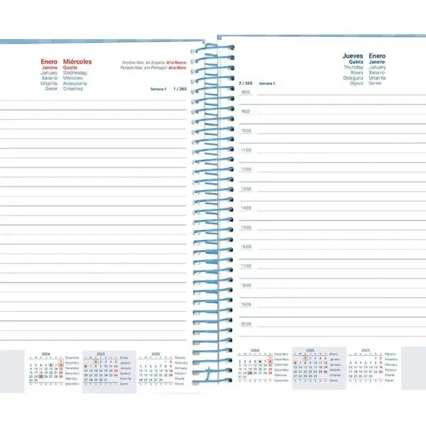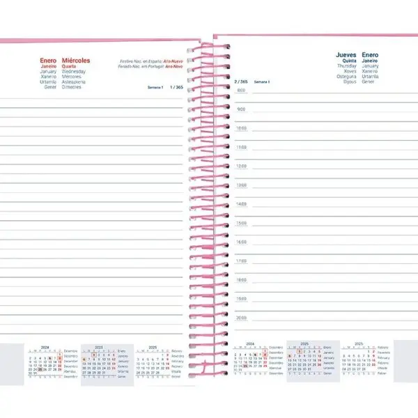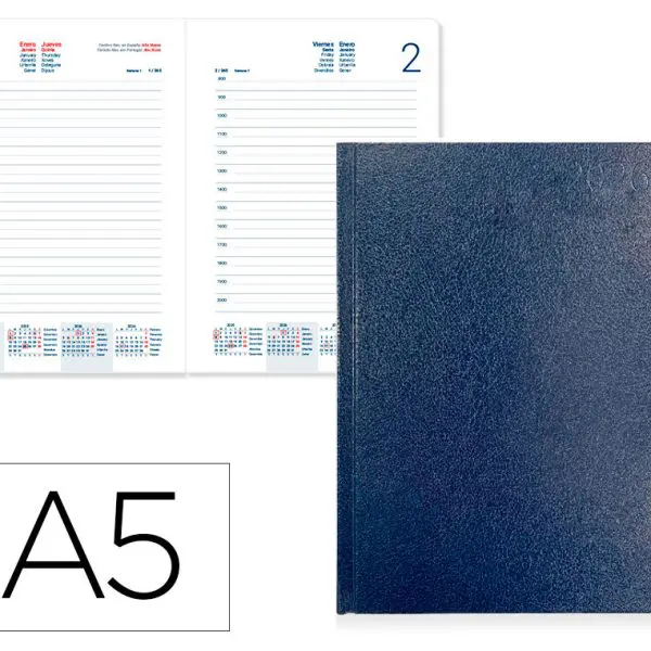 Interior com calendário trienal, planning anual, distâncias quilométricas, lista dos santos, folhas de notas e lista telefónica.